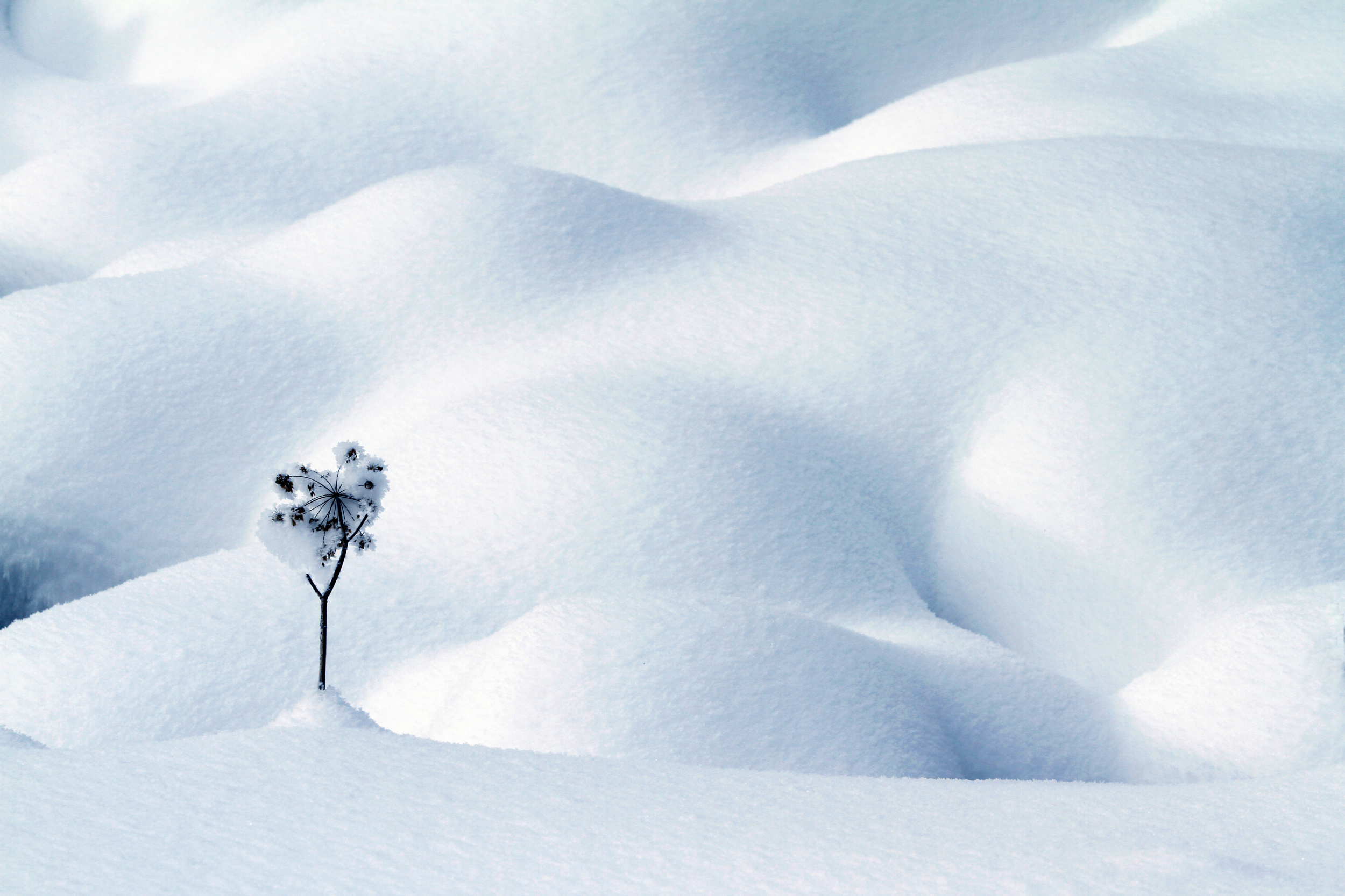 One of my favourite photos was taken in the southern Black Forest in Germany. I went out early one morning to photograph the pristine wintry landscape. It had snowed all night and the early morning revealed the most beautiful shades of powdery blue and white, with filtered sunlight making the textures and snow crystals sparkle. I was fascinated by the solitary small plant, a true survivor, standing amidst the many small rounded snow drifts.